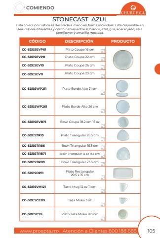 www.proepta.mxAtenci%u00f3n a Clientes 800 188 888COMIENDO105STONECAST AZULEsta colecci%u00f3n r%u00fastica es decorada a mano en forma individual. Est%u00e1 disponible en seis colores diferentes y combinables entre s%u00ed; blanco, azul, gris, anaranjado, azul cornflower y amarillo mostaza.Plato Triangular 26.5 cmBowl Coupe 18.2 cm 15 ozPlato Borde Alto 21 cmPlato Borde Alto 26 cmBowl Triangular 23.5 cmPlato Coupe 16 cmPlato Rectangular29.5 x 15 cmTarro Mug 12 oz 11 cmTaza Moka 3 ozPlato Taza Moka 11.8 cmBowl Triangular 13 oz 18.5 cmPlato Coupe 22 cmPlato Coupe 29 cmBowl Triangular 15.3 cmPlato Coupe 26 cmCC-SDESTR10CC-SDESEVB71CC-SDESWP211CC-SDESWP261CC-SDESTRB9CC-SDESEVP61CC-SDESOP11CC-SDESVM121CC-SDESCEB9CC-SDESESSCC-SDESTRB71CC-SDESEVP8CC-SDESEV11CC-SDESTRB6CC-SDESEV10121212121212121212121212121212C%u00d3DIGODESCRIPCI%u00d3NPRODUCTO