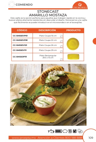www.proepta.mxAtenci%u00f3n a Clientes 800 188 888COMIENDO109STONECAST AMARILLO MOSTAZAPlato Coupe 16 cmPlato Rectangular29.5 x 15 cmPlato Coupe 22 cmPlato Coupe 29 cmPlato Coupe 26 cmCC-SMSSEVP61CC-SMSSOP111CC-SMSSEVP81CC-SMSSEV111CC-SMSSEV101Esta vajilla es la opci%u00f3n perfecta para aquellos que trabajan r%u00e1pido en la cocina y buscan platos altamente resistentes sin descuidar el dise%u00f1o. Stonecast es una vajilla que f%u00e1cilmente se puede introducir en el microoondas o en el lavavajillas.1212121212C%u00d3DIGODESCRIPCI%u00d3NPRODUCTO