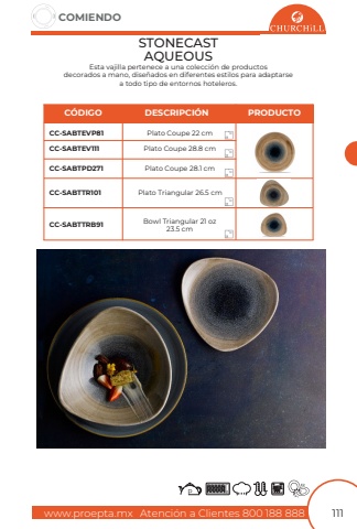 www.proepta.mxAtenci%u00f3n a Clientes 800 188 888COMIENDO111STONECAST AQUEOUSEsta vajilla pertenece a una colecci%u00f3n de productosdecorados a mano, dise%u00f1ados en diferentes estilos para adaptarsea todo tipo de entornos hoteleros.Plato Triangular 26.5 cmPlato Coupe 22 cmBowl Triangular 21 oz23.5 cmPlato Coupe 28.1 cmPlato Coupe 28.8 cmCC-SABTTR101CC-SABTEVP81CC-SABTTRB91CC-SABTPD271CC-SABTEV1111212121212C%u00d3DIGODESCRIPCI%u00d3NPRODUCTO