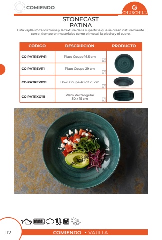 COMIENDOVAJILLACOMIENDO112STONECASTPATINAEsta vajilla imita los tonos y la textura de la superficie que se crean naturalmente con el tiempo en materiales como el metal, la piedra y el cueroBowl Coupe 40 oz 25 cmPlato Coupe 16.5 cmPlato Rectangular30 x 15 cmPlato Coupe 29 cmCC-PATREVB91CC-PATREVP61CC-PATRXO111CC-PATREV11112121212C%u00d3DIGODESCRIPCI%u00d3NPRODUCTO