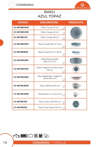 COMIENDOVAJILLACOMIENDO118RAKU AZUL TOPAZBowl Coupe 18 cm 15 ozBowl Coupe 19 cm 26 ozPlato Rectangular26.9 X 12.7 cmPlato Org%u00e1nico Centro Azul 26 cmBowl Redondo Org%u00e1nico 38 oz 26.4 cmPlato Coupe 16 cmTaza Caf%u00e9 8 oz 9.5 cmTaza Moka 3 1/2 oz 6.5 cmPlato Taza Caf%u00e9 15.6 cmPlato Taza Moka 11.8 cmPlato Coupe 22 cmPlato Coupe 29 cmCC-RKTBEVB71CC-RKTBEB191CC-RKTBXO101CC-RKTBOG101CC-RKTBOGB11CC-RKTBEVP61CC-RKTBCB201CC-RKTBCEB91CC-RKTBCSS1CC-RKTBESS1CC-RKTBEVP81CC-RKTBEV111121212121212121212121212C%u00d3DIGODESCRIPCI%u00d3NPRODUCTO