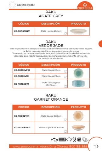 www.proepta.mxAtenci%u00f3n a Clientes 800 188 888COMIENDO119RAKU AGATE GREYRAKU GARNET ORANGEPlato Hondo 28.1 cmPlato Coupe 28.8 cmBowl Coupe 15 oz 18.2 cmCC-RKAGPD271CC-RKGOEV111CC-RKGOEVB71C%u00d3DIGOC%u00d3DIGODESCRIPCI%u00d3NDESCRIPCI%u00d3NPRODUCTOPRODUCTO121212RAKU VERDE JADEPlato Rectangular15 X 30 cmPlato Coupe 22 cmPlato Coupe 29 cmCC-RKJGXO111CC-RKJGEVP81CC-RKJGEV111Est%u00e1 inspirado en el proceso de acristalamiento tradicional, conocido como disparo de Raku, que crea resultados expresivos y emocionantes.Terminado en un atractivo Verde Jade, esta colecci%u00f3n de Studio Prints ha sidodise%u00f1ada para resistir las rigurosas demandas de un ambiente concurrido de servicio de alimentos.121212C%u00d3DIGODESCRIPCI%u00d3NPRODUCTO