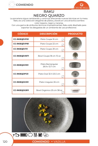 COMIENDOVAJILLACOMIENDO120RAKU NEGRO QUARZOLa porcelana sigue cambiando y contin%u00faa ofreciendo nuevas t%u00e9cnicas en la mesa. Raku es una colecci%u00f3n elegante de platos y bowls en una atractiva sombracolor topacio, negro y naranja.Con una gama de atributos t%u00e9cnicos impresionantes, Raku est%u00e1 dise%u00f1ado para soportar los desgastes de un ambiente de uso profesional.Bowl Coupe 18 cm 15 ozBowl Org%u00e1nico 25 cm 38 ozPlato Rectangular 26.9 x 12.7 cmPlato Irregular 26 cmPlato Oval 32 X 25.5 cm Plato Coupe 16 cmPlato Coupe 22 cmPlato Coupe 29 cmCC-RKBQEVB71CC-RKBQXO101CC-RKBQOGB11CC-RKBQOG101CC-RKBQOP121CC-RKBQEVP61CC-RKBQEVP81CC-RKBQEV111C%u00d3DIGODESCRIPCI%u00d3NPRODUCTO1212121212121212