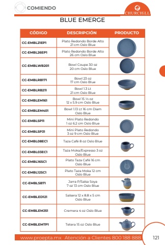 www.proepta.mxAtenci%u00f3n a Clientes 800 188 888COMIENDO121BLUE EMERGEPlato Redondo Borde Alto21 cm Oslo BlueBowl 15 1/3 oz12 x 5.9 cm Oslo BlueMini Plato Redondo1 oz 6.2 cm Oslo BlueBowl 23 oz17 cm Oslo BlueBowl Coupe 30 oz20 cm Oslo BlueTaza Caf%u00e9 8 oz Oslo BluePlato Taza Caf%u00e9 16 cmOslo BluePlato Redondo Borde Alto26 cm Oslo BlueBowl 1.13 Lt 16 cm DiamOslo BlueMini Plato Redondo3 oz 9 cm Oslo BlueBowl 1.3 Lt21 cm Oslo BlueTaza Moka/Expresso 3 ozOslo BluePlato Taza Moka 12 cmOslo BlueSalsera 12 x 8.8 x 5 cmOslo BlueJarra P/Salsa Soya7 oz 13 cm Oslo BlueCremera 4 oz Oslo BlueTetera 15 oz Oslo BlueCC-EMBL26EP1CC-EMBLEM401CC-EMBLSP31CC-EMBLRB211CC-EMBL03EC1CC-EMBL12SC1CC-EMBL21EP1CC-EMBLEM161CC-EMBLSP11CC-EMBLRB171CC-EMBL08EC1CC-EMBLWB201CC-EMBL16SC1C%u00d3DIGODESCRIPCI%u00d3NPRODUCTOCC-EMBLED121CC-EMBLSB71CC-EMBLEMJ51CC-EMBLEMTP1