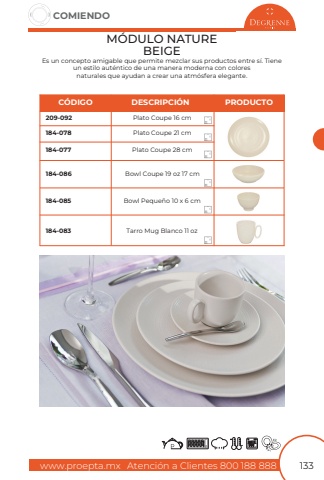 www.proepta.mxAtenci%u00f3n a Clientes 800 188 888COMIENDO133M%u00d3DULO NATURE BEIGEEs un concepto amigable que permite mezclar sus productos entre s%u00ed. Tieneun estilo aut%u00e9ntico de una manera moderna con coloresnaturales que ayudan a crear una atm%u00f3sfera elegante.Bowl Coupe 19 oz 17 cmPlato Coupe 16 cmBowl Peque%u00f1o 10 x 6 cmTarro Mug Blanco 11 ozPlato Coupe 21 cmPlato Coupe 28 cm184-086209-092184-085184-083184-078184-077C%u00d3DIGODESCRIPCI%u00d3NPRODUCTO