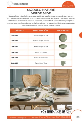 www.proepta.mxAtenci%u00f3n a Clientes 800 188 888COMIENDO135M%u00d3DULO NATURE VERDE JADEPlato Coupe 21 cmBowl 10 x 6 cmPlato Coupe 28 cmBowl 19 oz 17 cmBowl Coupe 21 cmTarro Mug 11 oz235-683235-686235-682235-687235-684246-420C%u00d3DIGODESCRIPCI%u00d3NPRODUCTONuestra l%u00ednea M%u00f3dulo Nature, reconocida por su dise%u00f1o contempor%u00e1neo y formas funcionales, se renueva con un tono lleno de frescura: verde jade. Esta nueva versi%u00f3n conserva la esencia natural de la colecci%u00f3n, sumando un color vibrante y elegante que conecta con la tendencia hacia lo org%u00e1nico y lo aut%u00e9ntico. Ideal para propuestas de mesa modernas con un toque de naturaleza.