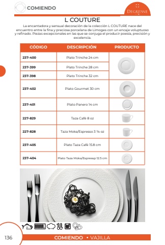 COMIENDOVAJILLACOMIENDO136L COUTURELa encantadora y sensual decoraci%u00f3n de la colecci%u00f3n L COUTURE nace delencuentro entre la fina y preciosa porcelana de Limoges con un encaje voluptuoso y refinado. Piezas excepcionales en las que se conjuga el producir poes%u00eda, precisi%u00f3n y excelencia.Plato Trinche 24 cmPlato Trinche 28 cmPlato Trinche 32 cmPlato Gourmet 30 cmPlato Panero 14 cmTaza Caf%u00e9 8 ozTaza Moka/Espresso 3 3/8 ozPlato Taza Caf%u00e9 15.8 cmPlato Taza Moka/Espressp 12.5 cm237-400237-399237-398237-402237-401227-829227-828237-405237-404C%u00d3DIGODESCRIPCI%u00d3NPRODUCTO