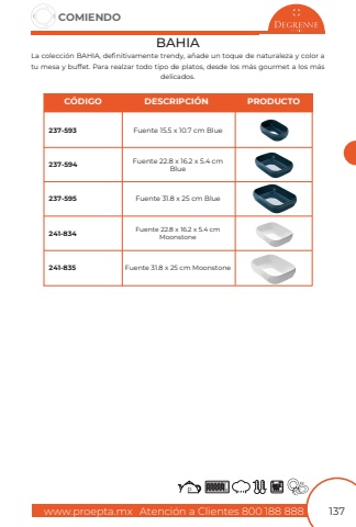 www.proepta.mxAtenci%u00f3n a Clientes 800 188 888COMIENDO137BAHIALa colecci%u00f3n BAHIA, definitivamente trendy, a%u00f1ade un toque de naturaleza y color a tu mesa y buffet. Para realzar todo tipo de platos, desde los m%u00e1s gourmet a los m%u00e1s delicados.Fuente 15.5 x 10.7 cm BlueFuente 22.8 x 16.2 x 5.4 cm BlueFuente 31.8 x 25 cm BlueFuente 22.8 x 16.2 x 5.4 cmMoonstoneFuente 31.8 x 25 cm Moonstone237-593237-594237-595241-834241-835C%u00d3DIGODESCRIPCI%u00d3NPRODUCTO