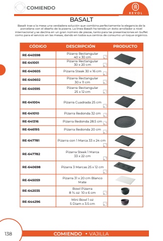 COMIENDOVAJILLACOMIENDO138BASALTBasalt trae a la mesa una verdadera soluci%u00f3n que combina perfectamente la elegancia de laporcelana con el dise%u00f1o de la pizarra. La l%u00ednea Basalt ha tenido un %u00e9xito arrollador a nivelinternacional y se declina en un gran n%u00famero de piezas, tanto para las presentaciones en buffet como para el servicio en las mesas, dando en todos sus centros de consumo un toque org%u00e1nico.Pizarra Rectangular40 x 30 cmPizarra Cuadrada 25 cmPizarra Rectangular30 x 20 cmPizarra Rectangular30 x 11 cmPizarra Redonda 28.5 cmPizarra Steak 30 x 16 cmPizarra Redonda 32 cmPizarra Rectangular25 x 12 cmPizarra Redonda 20 cmPizarra con 1 Marca 33 x 24 cmPizarra Steak 1 Marca33 x 22 cmPizarra 3 Marcas 25 x 12 cmPizarra 31 x 20 cm Blanco Mate Bowl Pizarra8 3/4 oz 10 x 6 cmMini Bowl 1 oz 5 Diam x 3.5 cmRE-640598RE-641004RE-641001RE-640602RE-641316RE-640605RE-641010RE-640595RE-646195RE-647781RE-647782RE-640698RE-645059RE-642035RE-644296C%u00d3DIGODESCRIPCI%u00d3NPRODUCTO