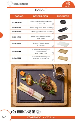 COMIENDOVAJILLACOMIENDO140BASALTBowl Pizarra Negro 24 3/4 oz 17 x 5.5 cmCharola Bamboo para Pizarra Steak37.5 x 28 x 2 cmPlato baguette 8 x 5 x 2 cmPlato baguette 15 x 5 x 2 cmPlato Rectangular Steak 32 x 21 cmPizarra Blanco Mate31 x 20 cmCharola Bamboo para Pizarra 34 x 19.5 cmRE-642496RE-649188RE-645765RE-645768RE-646118RE-645059RE-641792C%u00d3DIGODESCRIPCI%u00d3NPRODUCTO