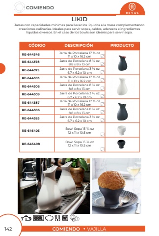 COMIENDOVAJILLACOMIENDO142LIKIDJarras con capacidades m%u00ednimas para llevar los l%u00edquidos a la mesa complementando creaciones culinarias. Ideales para servir sopas, caldos, aderezos e ingredientes l%u00edquidos diversos. En el caso de los bowls son ideales para servir sopa.Jarra de Porcelana 17 3/4 oz11 x 10 x 16.2 cmJarra de Porcelana 17 3/4 oz11 x 10 x 16.2 cmJarra de Porcelana 8 3/4 oz8.8 x 8 x 13 cmJarra de Porcelana 8 3/4 oz8.8 x 8 x 13 cmJarra de Porcelana 17 3/4 oz11 x 10 x 16.2 cmJarra de Porcelana 3 1/2 oz6.7 x 6.2 x 10 cmJarra de Porcelana 3 1/2 oz6.7 x 6.2 x 10 cmJarra de Porcelana 3 1/2 oz6.7 x 6.2 x 10 cmJarra de Porcelana 8 3/4 oz8.8 x 8 x 13 cmBowl Sopa 15 3/4 oz12 x 11 x 10.5 cmBowl Sopa 15 3/4 oz12 x 11 x 10.5 cmRE-644346RE-644387RE-644378RE-644386RE-644303RE-644309RE-644375RE-644385RE-644306RE-646403RE-646408C%u00d3DIGODESCRIPCI%u00d3NPRODUCTO