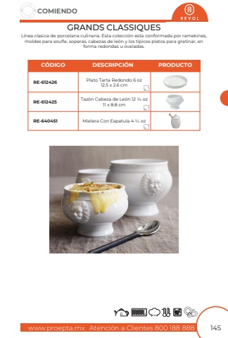 www.proepta.mxAtenci%u00f3n a Clientes 800 188 888COMIENDO145GRANDS CLASSIQUESL%u00ednea clasica de porcelana culinaria. Esta colecci%u00f3n esta conformada por ramekines, moldes para soufle, soperas, cabezas de le%u00f3n y los t%u00edpicos platos para gratinar, en forma redondas u ovaladas.Plato Tarta Redondo 6 oz12.5 x 2.6 cmTaz%u00f3n Cabeza de Le%u00f3n 12 1/4 oz 11 x 8.8 cmMielera Con Espatula 4 1/4 ozRE-612426RE-612425RE-640451C%u00d3DIGODESCRIPCI%u00d3NPRODUCTO