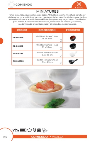 COMIENDOVAJILLACOMIENDO146MINIATURESUnos tama%u00f1os peque%u00f1os llenos de sabor. Atr%u00e9vete al esp%u00edritu miniatura para hacerde la cocina un arte l%u00fadico y sabroso. Las piezas de la colecci%u00f3n Miniatures se declinaen varios colores, acabados, blanco kilimanjaro, pizarras y negro hierro. Son idealespara buffets & cocktails con miniaturas, mezclando los colores y acabados, modernizando presentacionaes y divirtiendo a los comensales.Mini Bowl Sphere 1 1/2 oz7.5 x 5.3 cmMini Bowl Sphere 1 1/2 oz7.5 x 5.3 cmSart%u00e9n Miniatura 3/4 oz6.4 x 2.5 cmSart%u00e9n Miniatura 3/4 oz6.9 x 2.5 cmRE-645844RE-645845RE-615497RE-644705C%u00d3DIGODESCRIPCI%u00d3NPRODUCTO