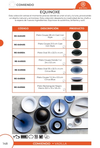 COMIENDOVAJILLACOMIENDO148EQUINOXEEsta colecci%u00f3n extrae el momento preciso donde se unen el sol y la luna, provocando un dise%u00f1o natural y armonioso. Esta colecci%u00f3n despierta la creatividad de los chefs a la espera de nuevos ingredientes. Equinoxe es aut%u00e9ntica, brillante y sutil.Plato Coupe 28 cm Cast Iron StylePlato Coupe Hondo 1 Lt 24 x 5.5 cmPlato Coupe 21.5 cm Cast Iron StylePlato Oval 35 x 22.3 x 4 cmPlato Coupe 1 lt 24 x 5.5 cmCirrus BluePlato Oval 35 x 22.3 x 4 cmCirrus BlueRE-649499RE-649505RE-649495RE-649554RE-649506RE-649556C%u00d3DIGODESCRIPCI%u00d3NPRODUCTOPlato Rectangular Negro RE-649566Hierro 32.5 x 15 x 1.8 cm