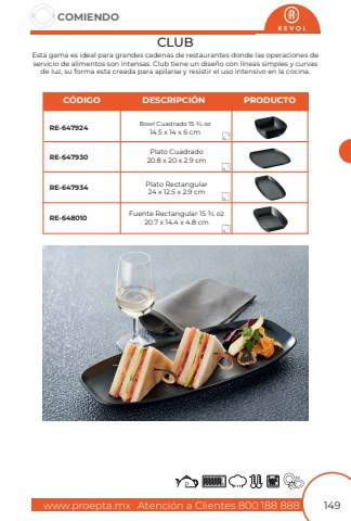www.proepta.mxAtenci%u00f3n a Clientes 800 188 888COMIENDO149CLUBEsta gama es ideal para grandes cadenas de restaurantes donde las operaciones de servicio de alimentos son intensas. Club tiene un dise%u00f1o con l%u00edneas simples y curvas de luz, su forma esta creada para apilarse y resistir el uso intensivo en la cocina.Plato Cuadrado20.8 x 20 x 2.9 cmPlato Rectangular24 x 12.5 x 2.9 cmBowl Cuadrado 15 3/4 oz14.5 x 14 x 6 cmFuente Rectangular 15 3/4 oz20.7 x 14.4 x 4.8 cmRE-647930RE-647934RE-647924RE-648010C%u00d3DIGODESCRIPCI%u00d3NPRODUCTO