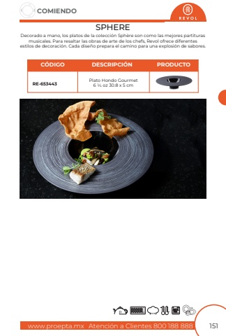 www.proepta.mxAtenci%u00f3n a Clientes 800 188 888COMIENDO151SPHEREDecorado a mano, los platos de la colecci%u00f3n Sph%u00e8re son como las mejores partituras musicales. Para resaltar las obras de arte de los chefs, Revol ofrece diferentesestilos de decoraci%u00f3n. Cada dise%u00f1o prepara el camino para una explosi%u00f3n de sabores.Plato Hondo GourmetRE-6534436 1/4 oz 30.8 x 5 cmC%u00d3DIGODESCRIPCI%u00d3NPRODUCTO