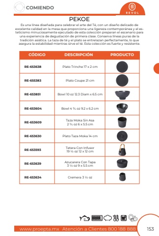www.proepta.mxAtenci%u00f3n a Clientes 800 188 888COMIENDO153PEKOEEs una l%u00ednea dise%u00f1ada para celebrar el arte del T%u00e9, con un dise%u00f1o delicado de excelente calidad en la mesa que proporciona una ligereza contempor%u00e1nea y el esteticismo minuciosamente ejecutado de esta colecci%u00f3n preparan el escenario para una experiencia de degustaci%u00f3n de primera clase. Conserva l%u00edneas puras de la tradici%u00f3n asi%u00e1tica. La taza de t%u00e9 y el plato se entrelazan perfectamente, lo que asegura la estabilidad mientras sirve el t%u00e9. Esta colecci%u00f3n es fuerte y resistente.Plato Trinche 17 x 2 cmPlato Coupe 21 cmBowl 10 oz 12.3 Diam x 6.5 cmBowl 4 3/4 oz 9.2 x 6.2 cmTaza Moka Sin Asa2 3/4 oz 6 x 5.5 cmPlato Taza Moka 14 cmTetera Con Infusor19 1/2 oz 12 x 12 cmAzucarera Con Tapa3 1/2 oz 9 x 5.5 cmCremera 3 1/2 ozRE-653638RE-655383RE-653851RE-653604RE-653609RE-653630RE-653593RE-653639RE-653634C%u00d3DIGODESCRIPCI%u00d3NPRODUCTO