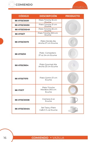 COMIENDOVAJILLACOMIENDO16Plato Trinche 16 cmEcumePlato Trinche 21 cmEcumePlato Trinche 26 cmEcumePlato Trinche 29.5 cmEcumeBE-0733/20251BE-0733/20250BE-0733/20249BE-0733/7Plato Hondo Ala Ancha 27 cm EcumePlato Gourmet Ala Ancha 23 cm EcumePlato Centro 31 cmEcumePlato Trinche Mordore 29.5 cmEcumeCremera 6 ozEcumePlato Compotero27 oz 24 cm EcumeBE-0733/21273BE-0733/3634BE-0733/7373BE-1721/7BE-0733/20338BE-0733/53Set Taza y Plato Caf%u00e9 5 3/4 oz EcumeBE-0733/20454C%u00d3DIGODESCRIPCI%u00d3NPRODUCTO