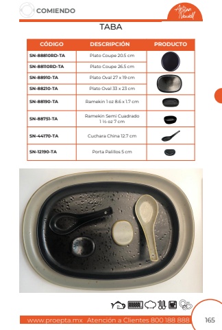 www.proepta.mxAtenci%u00f3n a Clientes 800 188 888COMIENDO165TABARamekin Semi Cuadrado 1 1/2 oz 7 cmCuchara China 12.7 cmPlato Oval 33 x 23 cmPlato Coupe 26.5 cmPlato Oval 27 x 19 cmPlato Coupe 20.5 cmPorta Palillos 5 cmRamekin 1 oz 8.6 x 1.7 cmSN-88910-TASN-88810RD-TASN-88751-TASN-44170-TASN-88210-TASN-88110RD-TASN-12190-TASN-88190-TAC%u00d3DIGODESCRIPCI%u00d3NPRODUCTO