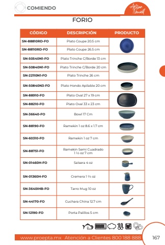 www.proepta.mxAtenci%u00f3n a Clientes 800 188 888COMIENDO167FORIOPlato Hondo Apilable 20 cmPlato Oval 27 x 19 cmBowl 17 CmRamekin Semi Cuadrado 1 1/2 oz 7 cmCuchara China 12.7 cmCremera 1 2/3 ozPlato Oval 33 x 23 cmRamekin 1 oz 7 cmRamekin 1 oz 8.6 x 1.7 cmSalsera 4 ozPorta Palillos 5 cmTarro Mug 10 ozPlato Trinche C/Borde 13 cmPlato Trinche C/Borde 20 cmPlato Trinche 26 cmSN-50840N3-FOSN-88910-FOSN-36640-FOSN-88751-FOSN-44170-FOSN-01360H-FOSN-88210-FOSN-60310-FOSN-88190-FOSN-01460H-FOSN-12190-FOSN-3640IHB-FOSN-50540N1-FOSN-50840N1-FOSN-22110N1-FOC%u00d3DIGODESCRIPCI%u00d3NPRODUCTOPlato Coupe 26.5 cmSN-88810RD-FOPlato Coupe 20.5 cmSN-88110RD-FO
