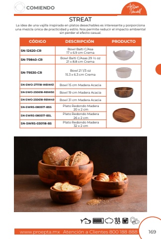 www.proepta.mxAtenci%u00f3n a Clientes 800 188 888COMIENDO169STREATLa idea de una vajilla inspirada en platos desechables es interesante y porporciona una mezcla %u00fanica de practicidad y estilo. Nos permite reducir el impacto ambiental sin perder el efecto casual.Bowl Balti C/Asa17 x 6.9 cm CremaBowl Balti C/Asas 29 1/2 oz21 x 8.8 cm CremaSN-12620-CRSN-79840-CRC%u00d3DIGODESCRIPCI%u00d3NPRODUCTOBowl 21 1/3 oz15.3 x 6.3 cm CremaBowl 15 cm Madera AcaciaBowl 19 cm Madera AcaciaBowl 31 cm Madera AcaciaSN-79530-CRSN-SWO-271118-WBW61SN-SWO-250618-RBW50SN-SWO-250618-RBW49Plato Redondo Madera20 x 2 cmPlato Redondo Madera26 x 2 cmPlato Redondo Madera32 x 2 cmSN-SWRS-080517-B5SSN-SWRS-080517-B5LSN-SWRS-030118-B5