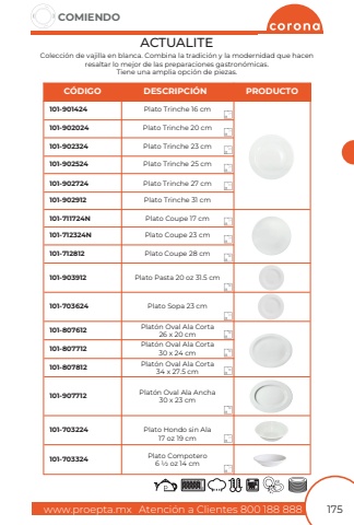 www.proepta.mxAtenci%u00f3n a Clientes 800 188 888COMIENDO175ACTUALITEColecci%u00f3n de vajilla en blanca. Combina la tradici%u00f3n y la modernidad que hacenresaltar lo mejor de las preparaciones gastron%u00f3micas.Tiene una amplia opci%u00f3n de piezas.Plato Trinche 31 cmPlato Coupe 17 cmPlato Trinche 27 cmPlato Coupe 23 cmPlato Trinche 23 cmPlat%u00f3n Oval Ala Corta 26 x 20 cmPlato Trinche 16 cmPlato Trinche 25 cmPlato Coupe 28 cmPlato Trinche 20 cmPlat%u00f3n Oval Ala Corta 30 x 24 cmPlato Pasta 20 oz 31.5 cmPlato Sopa 23 cmPlat%u00f3n Oval Ala Corta 34 x 27.5 cmPlat%u00f3n Oval Ala Ancha 30 x 23 cmPlato Hondo sin Ala17 oz 19 cmPlato Compotero6 1/2 oz 14 cm101-902912101-711724N101-902724101-712324N101-902324101-807612101-901424101-902524101-712812101-902024101-807712101-903912101-703624101-807812101-907712101-703224101-703324C%u00d3DIGODESCRIPCI%u00d3NPRODUCTO121212121212