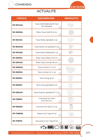 www.proepta.mxAtenci%u00f3n a Clientes 800 188 888COMIENDO177ACTUALITETaza Caf%u00e9 Redonda 8 3/4ozNo ApliablePlato Taza Caf%u00e9 15.5 cmTaza Moka Apilable 4 ozPlato Taza Moka 12.5 cmTaza Jumbo 11 1/2 ozTarro Mug 12 ozTaza Mug No Apilable 13 1/4 ozCremera Sin Asa 2 3/4 ozAzucarera Con Tapa 8 ozTaza Moka no Apilable 3 ozTaza Moka Redonda 3 ozPlato Taza Jumbo 18 cmTaza Jumbo 14 1/4 ozTarro Mug Apilable 9 ozCremera Con Asa8 oz 13.5 cmTetera Con Tapa 12 oz101-904424101-900324101-904124101-900124101-906024101-606124101-526424101-909224101-708712101-804024101-904224101-520424101-906224101-906312101-708512101-708006C%u00d3DIGODESCRIPCI%u00d3NPRODUCTO121212