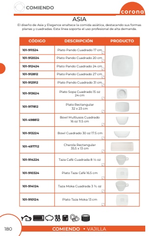 COMIENDOVAJILLACOMIENDO180ASIAEl dise%u00f1o de Asia y Elegance enaltece la comida asi%u00e1tica, destacando sus formas planas y cuadradas. Esta l%u00ednea soporta el uso profesional de alta demanda.Plato Pando Cuadrado 31 cmPlato Pando Cuadrado 24 cmPlato Pando Cuadrado 17 cmPlato Pando Cuadrado 27 cmPlato Pando Cuadrado 20 cmPlato Sopa Cuadrado 15 oz 24 cmPlato Rectangular 32 x 23 cmTaza Caf%u00e9 Cuadrada 8 1/2 ozBowl Multiusos Cuadrado16 oz 11.5 cmPlato Taza Caf%u00e9 16.5 cmBowl Cuadrado 30 oz 17.5 cmTaza Moka Cuadrada 3 3/4 ozCharola Rectangular35.5 x 13 cmPlato Taza Moka 13 cm101-912912101-912424101-911524101-912812101-912024101-913624101-917812101-914224101-498812101-910324101-913224101-914124101-497712101-9101241212121212C%u00d3DIGODESCRIPCI%u00d3NPRODUCTO