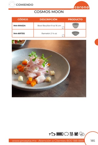 www.proepta.mxAtenci%u00f3n a Clientes 800 188 888COMIENDO185COSMOS MOONC%u00d3DIGODESCRIPCI%u00d3NPRODUCTOBowl Bouillon 9 oz 16 cmRamekin 2 2/5 oz944-904524944-8973121212
