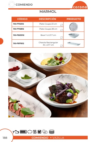 COMIENDOVAJILLACOMIENDO188MARMOLPlato Coupe 28 cmPlato Coupe 23 cmBowl 1 Lt 21.7 cm110-F712812110-F712312110-F923312C%u00d3DIGODESCRIPCI%u00d3NPRODUCTO121212Charola Rectangular34 x 21.7 cm110-F91761212