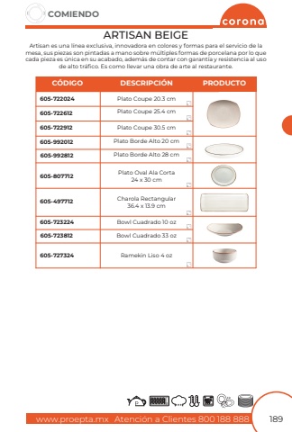 www.proepta.mxAtenci%u00f3n a Clientes 800 188 888COMIENDO189ARTISAN BEIGEArtisan es una l%u00ednea exclusiva, innovadora en colores y formas para el servicio de lamesa, sus piezas son pintadas a mano sobre m%u00faltiples formas de porcelana por lo que cada pieza es %u00fanica en su acabado, adem%u00e1s de contar con garant%u00eda y resistencia al uso de alto tr%u00e1fico. Es como llevar una obra de arte al restaurante.Plato Coupe 30.5 cmPlato Coupe 20.3 cmPlato Coupe 25.4 cmCharola Rectangular36.4 x 13.9 cmPlato Oval Ala Corta24 x 30 cmBowl Cuadrado 10 ozPlato Borde Alto 20 cmBowl Cuadrado 33 ozPlato Borde Alto 28 cmRamekin Liso 4 oz605-722912605-722024605-722612605-497712605-807712605-723224605-992012605-723812605-992812605-727324C%u00d3DIGODESCRIPCI%u00d3NPRODUCTO12121212121212