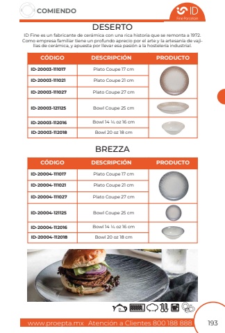 www.proepta.mxAtenci%u00f3n a Clientes 800 188 888COMIENDO193DESERTOBREZZAID Fine es un fabricante de cer%u00e1mica con una rica historia que se remonta a 1972. Como empresa familiar tiene un profundo aprecio por el arte y la artesan%u00eda de vajillas de cer%u00e1mica, y apuesta por llevar esa pasi%u00f3n a la hosteler%u00eda industrial.Plato Coupe 27 cmPlato Coupe 27 cmPlato Coupe 17 cmPlato Coupe 17 cmPlato Coupe 21 cmPlato Coupe 21 cmID-20003-111027ID-20004-111027ID-20003-111017ID-20004-111017ID-20003-111021ID-20004-111021C%u00d3DIGOC%u00d3DIGODESCRIPCI%u00d3NDESCRIPCI%u00d3NPRODUCTOPRODUCTOBowl Coupe 25 cmBowl Coupe 25 cmID-20003-121125ID-20004-121125Bowl 14 1/4 oz 16 cmBowl 14 1/4 oz 16 cmBowl 20 oz 18 cmBowl 20 oz 18 cmID-20003-112016ID-20004-112016ID-20003-112018ID-20004-112018