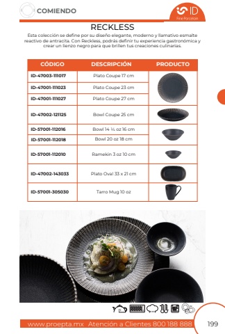 www.proepta.mxAtenci%u00f3n a Clientes 800 188 888COMIENDO199RECKLESSEsta colecci%u00f3n se define por su dise%u00f1o elegante, moderno y llamativo esmaltereactivo de antracita. Con Reckless, podr%u00e1s definir tu experiencia gastron%u00f3mica y crear un lienzo negro para que brillen tus creaciones culinarias.Plato Coupe 27 cmPlato Coupe 17 cmPlato Coupe 23 cmID-47001-111027ID-47003-111017ID-47001-111023C%u00d3DIGODESCRIPCI%u00d3NPRODUCTOBowl Coupe 25 cmRamekin 3 oz 10 cmPlato Oval 33 x 21 cmTarro Mug 10 ozID-47002-121125ID-57001-112010ID-47002-143033ID-57001-305030Bowl 14 1/4 oz 16 cmBowl 20 oz 18 cmID-57001-112016ID-57001-112018