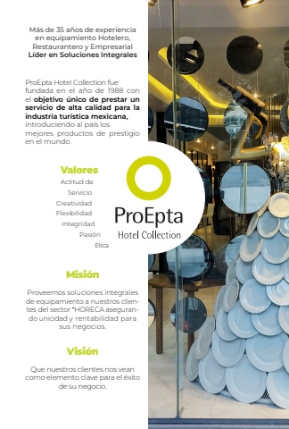 M%u00e1s de 35 a%u00f1os de experiencia en equipamiento Hotelero, Restaurantero y EmpresarialL%u00edder en Soluciones IntegralesProEpta Hotel Collection fue fundada en el a%u00f1o de 1988 con el objetivo %u00fanico de prestar un servicio de alta calidad para la industria tur%u00edstica mexicana,introduciendo al pa%u00eds los mejores productos de prestigio en el mundo. Misi%u00f3nProveemos soluciones integrales de equipamiento a nuestros clientes del sector *HORECA asegurando unicidad y rentabilidad para sus negocios.Visi%u00f3nQue nuestros clientes nos vean como elemento clave para el %u00e9xito de su negocio.ValoresActitud de ServicioCreatividadFlexibilidadIntegridadPasi%u00f3n%u00c9tica