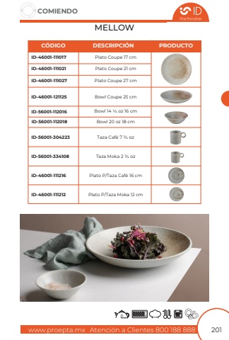 www.proepta.mxAtenci%u00f3n a Clientes 800 188 888COMIENDO201MELLOWPlato Coupe 27 cmPlato Coupe 17 cmPlato Coupe 21 cmID-46001-111027ID-46001-111017ID-46001-111021C%u00d3DIGODESCRIPCI%u00d3NPRODUCTOBowl Coupe 25 cmTaza Caf%u00e9 7 3/4 ozTaza Moka 2 3/4 ozPlato P/Taza Caf%u00e9 16 cmPlato P/Taza Moka 12 cmID-46001-121125ID-56001-304223ID-56001-334108ID-46001-111216ID-46001-111212Bowl 14 1/4 oz 16 cmBowl 20 oz 18 cmID-56001-112016ID-56001-112018