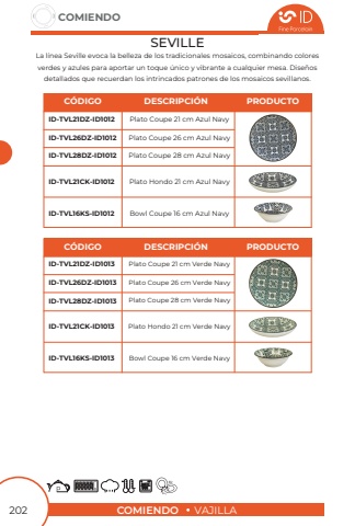 COMIENDOVAJILLACOMIENDO202SEVILLELa l%u00ednea Seville evoca la belleza de los tradicionales mosaicos, combinando colores verdes y azules para aportar un toque %u00fanico y vibrante a cualquier mesa. Dise%u00f1os detallados que recuerdan los intrincados patrones de los mosaicos sevillanos.Plato Coupe 28 cm Azul NavyPlato Coupe 28 cm Verde NavyPlato Coupe 21 cm Azul NavyPlato Coupe 21 cm Verde NavyPlato Coupe 26 cm Azul NavyPlato Coupe 26 cm Verde NavyID-TVL28DZ-ID1012ID-TVL28DZ-ID1013ID-TVL21DZ-ID1012ID-TVL21DZ-ID1013ID-TVL26DZ-ID1012ID-TVL26DZ-ID1013C%u00d3DIGOC%u00d3DIGODESCRIPCI%u00d3NDESCRIPCI%u00d3NPRODUCTOPRODUCTOPlato Hondo 21 cm Azul NavyPlato Hondo 21 cm Verde NavyBowl Coupe 16 cm Azul NavyBowl Coupe 16 cm Verde NavyID-TVL21CK-ID1012ID-TVL21CK-ID1013ID-TVL16KS-ID1012ID-TVL16KS-ID1013