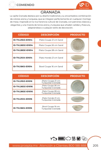 www.proepta.mxAtenci%u00f3n a Clientes 800 188 888COMIENDO205GRANADALa vajilla Granada destaca por su dise%u00f1o tradicional y su encantadora combinaci%u00f3n de colores arena y turquesa, que se integran perfectamente en cualquier montaje de mesa. Inspirado en la rica herencia cultural de Granada, con patrones cl%u00e1sicos y elegantes y una mezcla de tonos arena y turquesa que a%u00f1aden calidez y frescura,adapt%u00e1ndose a cualquier estilo de decoraci%u00f3n.Plato Coupe 28 cm SandPlato Coupe 28 cmTurquoise GranadaPlato Coupe 21 cm SandPlato Coupe 21 cmTurquoise GranadaPlato Coupe 26 cm SandPlato Coupe 26 cmTurquoise GranadaID-TVL28DZ-ID1014ID-TVL28DZ-ID1016ID-TVL21DZ-ID1014ID-TVL21DZ-ID1016ID-TVL26DZ-ID1014ID-TVL26DZ-ID1016C%u00d3DIGOC%u00d3DIGODESCRIPCI%u00d3NDESCRIPCI%u00d3NPRODUCTOPRODUCTOPlato Hondo 21 cm SandPlato Hondo 21 cmTurquoise GranadaBowl Coupe 16 cm SandBowl Coupe 16 cmTurquoise GranadaID-TVL21CK-ID1014ID-TVL21CK-ID1016ID-TVL16KS-ID1014ID-TVL16KS-ID1016