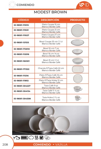 COMIENDOVAJILLACOMIENDO208MODEST BROWNPlato Coupe 15 cmBlanco Borde Caf%u00e9Plato Coupe 21 cmBlanco Borde Caf%u00e9Bowl 10 cm 7 ozBlanco Borde Caf%u00e9Plato P/Taza Caf%u00e9 16 cmBlanco Borde Caf%u00e9Taza Caf%u00e9 9 ozBlanco Borde Caf%u00e9Plato Coupe 27 cmBlanco Borde Caf%u00e9Bowl 16 cm 14 ozBlanco Borde Caf%u00e9Plato P/Taza Moka 12 cmBlanco Borde Caf%u00e9Taza Caf%u00e9 11 1/2 ozBlanco Borde Caf%u00e9ID-18001-111027ID-18001-112016ID-18001-111812ID-18001-304134ID-18001-111015ID-18001-111021ID-18001-172010ID-18001-111216ID-18001-304227C%u00d3DIGODESCRIPCI%u00d3NPRODUCTOBowl Coupe 25 cm 1.1 LtBlanco Borde Caf%u00e9Bowl 21 cm 1.1 LtBlanco Borde Caf%u00e9Charola P/Taza Caf%u00e9 22 cmBlanco Borde Caf%u00e9Taza Moka 2 3/4 ozBlanco Borde Caf%u00e9ID-18001-121125ID-18001-162021ID-18001-171322ID-18001-304308