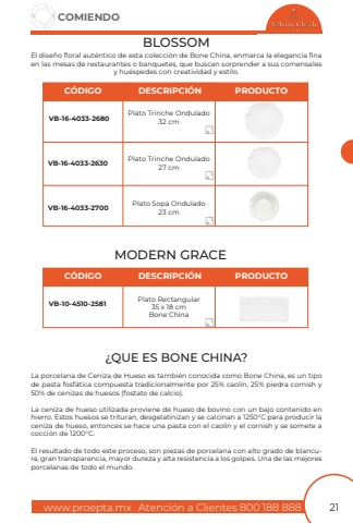 www.proepta.mxAtenci%u00f3n a Clientes 800 188 888COMIENDO21Plato Trinche Ondulado 27 cmPlato Trinche Ondulado 32 cm Plato Rectangular 35 x 18 cm Bone ChinaPlato Sopa Ondulado 23 cmVB-16-4033-2680VB-10-4510-2581VB-16-4033-2700VB-16-4033-2630%u00bfQUE ES BONE CHINA?La porcelana de Ceniza de Hueso es tambi%u00e9n conocida como Bone China, es un tipo de pasta fosf%u00e1tica compuesta tradicionalmente por 25% caol%u00edn, 25% piedra cornish y 50% de cenizas de huesos (fostato de calcio).La ceniza de hueso utilizada proviene de hueso de bovino con un bajo contenido en hierro. Estos huesos se trituran, desgelatinizan y se calcinan a 1250%u00b0C para producir la ceniza de hueso, entonces se hace una pasta con el caol%u00edn y el cornish y se somete a cocci%u00f3n de 1200%u00b0C.El resultado de todo este proceso, son piezas de porcelana con alto grado de blancura, gran transparencia, mayor dureza y alta resistencia a los golpes. Una de las mejores porcelanas de todo el mundo. El dise%u00f1o floral aut%u00e9ntico de esta colecci%u00f3n de Bone China, enmarca la elegancia fina en las mesas de restaurantes o banquetes, que buscan sorprender a sus comensales y hu%u00e9spedes con creatividad y estilo. BLOSSOMMODERN GRACEC%u00d3DIGOC%u00d3DIGODESCRIPCI%u00d3NDESCRIPCI%u00d3NPRODUCTOPRODUCTO