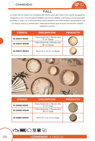 COMIENDOVAJILLACOMIENDO210FALLLa l%u00ednea Fall se inspira en la paleta del oto%u00f1o para dar vida a una vajilla acogedora, elegante y con mucha personalidad. Sus tonos c%u00e1lidos y terrosos evocan paisajes oto%u00f1ales y crean un marco perfecto para platillos reconfortantes o propuestas con un toque r%u00fastico y sofisticado. Ideal para mesas que buscan transmitir calidez,tradici%u00f3n y estilo.Plato Redondo C/Borde Alto21 cm BeigePlato Redondo C/Borde Alto21 cm SagePlato Redondo C/Borde Alto28 cm BeigePlato Redondo C/Borde Alto28 cm SageBowl 15 1/2 oz 14 cm BeigeBowl 15 1/2 oz 14 cm SageID-20647-161021ID-20650-161021ID-20647-161028ID-20650-161028ID-20647-162014ID-20650-162014C%u00d3DIGOC%u00d3DIGODESCRIPCI%u00d3NDESCRIPCI%u00d3NPRODUCTOPRODUCTO