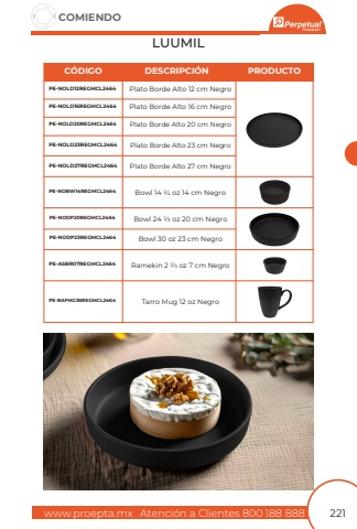 www.proepta.mxAtenci%u00f3n a Clientes 800 188 888COMIENDO221LUUMILPlato Borde Alto 12 cm NegroPlato Borde Alto 16 cm NegroPlato Borde Alto 20 cm NegroPlato Borde Alto 23 cm NegroPlato Borde Alto 27 cm NegroPE-NOLD20REGMCL2464PE-NOLD23REGMCL2464PE-NOLD27REGMCL2464PE-NOLD12REGMCL2464PE-NOLD16REGMCL2464C%u00d3DIGODESCRIPCI%u00d3NPRODUCTOBowl 14 2/4 oz 14 cm NegroRamekin 2 2/3 oz 7 cm NegroTarro Mug 12 oz NegroPE-NOBW14REGMCL2464PE-ASBR07REGMCL2464PE-BAFMG36REGMCL2464Bowl 24 2/3 oz 20 cm NegroBowl 30 oz 23 cm NegroPE-NODP20REGMCL2464PE-NODP23REGMCL2464
