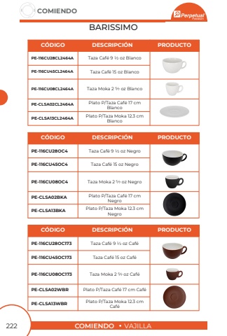 COMIENDOVAJILLACOMIENDO222BARISSIMOTaza Caf%u00e9 9 1/2 oz BlancoTaza Caf%u00e9 9 1/2 oz NegroTaza Caf%u00e9 9 1/2 oz Caf%u00e9Plato P/Taza Caf%u00e9 17 cm BlancoPlato P/Taza Caf%u00e9 17 cm NegroPlato P/Taza Caf%u00e9 17 cm Caf%u00e9Taza Caf%u00e9 15 oz BlancoTaza Caf%u00e9 15 oz NegroTaza Caf%u00e9 15 oz Caf%u00e9Plato P/Taza Moka 12.3 cmBlancoPlato P/Taza Moka 12.3 cmNegroPlato P/Taza Moka 12.3 cm Caf%u00e9Taza Moka 2 5/7 oz BlancoTaza Moka 2 5/7 oz NegroTaza Moka 2 5/7 oz Caf%u00e9PE-116CU28CL2464APE-116CU28OC4PE-116CU28OC173PE-CLSA02CL2464APE-CLSA02BKAPE-CLSA02WBRPE-116CU45CL2464APE-116CU45OC4PE-116CU45OC173PE-CLSA13CL2464APE-CLSA13BKAPE-CLSA13WBRPE-116CU08CL2464APE-116CU08OC4PE-116CU08OC173C%u00d3DIGOC%u00d3DIGOC%u00d3DIGODESCRIPCI%u00d3NDESCRIPCI%u00d3NDESCRIPCI%u00d3NPRODUCTOPRODUCTOPRODUCTO