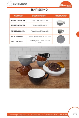 www.proepta.mxAtenci%u00f3n a Clientes 800 188 888COMIENDO223BARISSIMOTaza Caf%u00e9 9 1/2 oz GrisPlato P/Taza Caf%u00e9 17 cm GrisTaza Caf%u00e9 15 oz GrisPlato P/Taza Moka 12.3 cmGrisTaza Moka 2 5/7 oz GrisPE-116CU28OC174PE-CLSA02KGYPE-116CU45OC174PE-CLSA13KGYPE-116CU08OC174C%u00d3DIGODESCRIPCI%u00d3NPRODUCTO