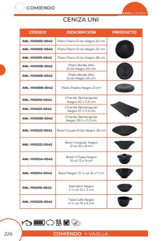 COMIENDOVAJILLACOMIENDO226CENIZA UNIPlato Plano Erizo Negro 20 cmCharola RectangularNegro 20 x 11.5 cmCharola RectangularNegro 27 x 11.5 cmCharola RectangularNegro 35.5 x 11.5 cmPlato Plano Erizo Negro 25 cmPlato Plano Erizo Negro 28 cmPlato Borde AltoErizo Negro 20 cmPlato Borde AltoErizo Negro 25 cmANL-YK0001-0042ANL-YK0009-0042ANL-YK0003-0042ANL-YK0010-0042ANL-YK0002-0042ANL-YK0021-0042C%u00d3DIGODESCRIPCI%u00d3NPRODUCTOANL-YK0006-0042ANL-YK0005-0042Bowl Coupe Erizo Negro 26 cmPlato Piedra Negro 21 cm Bowl Irregular Negro31 oz 22 x 8 cmBowl Negro 13 1/2 oz 16 x 7 cmBowl C/Tapa Negro10 oz 12 x 9 cmRamekin Negro2 1/3 oz 10 x 3 cmTaza Caf%u00e9 Negro6 3/4 oz 10 x 6 cmANL-YK0023-0042ANL-YK0008-0042ANL-YK0022-0042ANL-YK0014-0042ANL-YK0024-0042ANL-YK0015-0042ANL-YK0025-0042