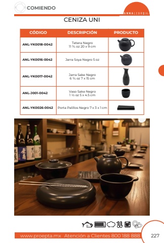 www.proepta.mxAtenci%u00f3n a Clientes 800 188 888COMIENDO227CENIZA UNIC%u00d3DIGODESCRIPCI%u00d3NPRODUCTOTetera Negro11 3/4 oz 20 x 9 cmPorta Palillos Negro 7 x 3 x 1 cmJarra Soya Negro 5 ozVaso Sake Negro1 1/2 oz 5 x 4.5 cmJarra Sake Negro 6 3/4 oz 7 x 15 cmANL-YK0018-0042ANL-YK0026-0042ANL-YK0016-0042ANL-J001-0042ANL-YK0017-0042