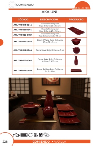 COMIENDOVAJILLACOMIENDO228AKA UNICharola RectangularRojo Brillante 20 x 11.5 cmCharola RectangularRojo Brillante 27 x 11.5 cmCharola RectangularRojo Brillante 35.5 x 11.5 cmBowl C/Tapa Rojo Brillante10 oz 12 x 9 cmJarra Soya Rojo Brillante 5 ozPorta Palillos Rojo Brillante7 x 3 x 1 cmJarra Sake Rojo Brillante6 3/4 oz 7 x 15 cmANL-YK0009-0044ANL-YK0010-0044ANL-YK0021-0044C%u00d3DIGODESCRIPCI%u00d3NPRODUCTOANL-YK0024-0044ANL-YK0016-0044ANL-YK0026-0044ANL-YK0017-0044