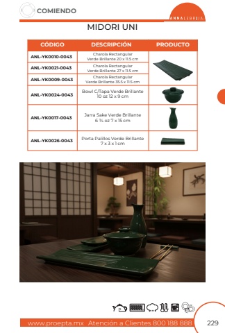 www.proepta.mxAtenci%u00f3n a Clientes 800 188 888COMIENDO229MIDORI UNICharola RectangularVerde Brillante 20 x 11.5 cmCharola RectangularVerde Brillante 27 x 11.5 cmCharola RectangularVerde Brillante 35.5 x 11.5 cmBowl C/Tapa Verde Brillante10 oz 12 x 9 cmPorta Palillos Verde Brillante7 x 3 x 1 cmJarra Sake Verde Brillante6 3/4 oz 7 x 15 cmANL-YK0009-0043ANL-YK0010-0043ANL-YK0021-0043C%u00d3DIGODESCRIPCI%u00d3NPRODUCTOANL-YK0024-0043ANL-YK0026-0043ANL-YK0017-0043
