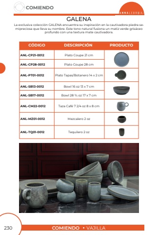COMIENDOVAJILLACOMIENDO230GALENALa exclusiva colecci%u00f3n GALENA encuentra su inspiraci%u00f3n en la cautivadora piedra semipreciosa que lleva su nombre. Este tono natural fusiona un matiz verde gris%u00e1ceo profundo con una textura mate cautivadora.Plato Coupe 21 cmBowl 16 oz 13 x 7 cmPlato Coupe 28 cmBowl 28 3/4 oz 17 x 7 cmANL-CP21-0012ANL-SB13-0012ANL-CP28-0012ANL-SB17-0012C%u00d3DIGODESCRIPCI%u00d3NPRODUCTOPlato Tapas/Botanero 14 x 2 cmTaza Caf%u00e9 7 2/4 oz 8 x 8 cmMezcalero 2 ozTequilero 2 ozANL-PT01-0012ANL-CM22-0012ANL-MZ01-0012ANL-TQ01-0012