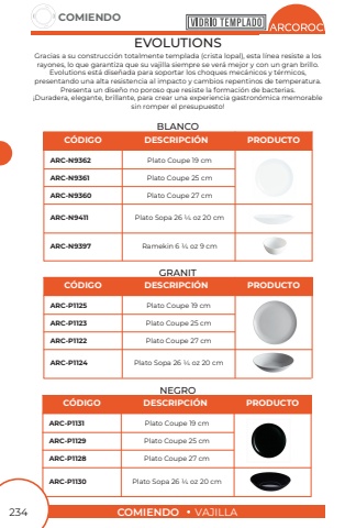COMIENDOVAJILLACOMIENDO234EVOLUTIONSGracias a su construcci%u00f3n totalmente templada (crista lopal), esta l%u00ednea resiste a losrayones, lo que garantiza que su vajilla siempre se ver%u00e1 mejor y con un gran brillo. Evolutions est%u00e1 dise%u00f1ada para soportar los choques mec%u00e1nicos y t%u00e9rmicos,presentando una alta resistencia al impacto y cambios repentinos de temperatura. Presenta un dise%u00f1o no poroso que resiste la formaci%u00f3n de bacterias. %u00a1Duradera, elegante, brillante, para crear una experiencia gastron%u00f3mica memorable sin romper el presupuesto!BLANCOGRANITNEGROPlato Coupe 19 cmPlato Coupe 25 cmPlato Coupe 27 cmPlato Sopa 26 1/4 oz 20 cmRamekin 6 1/4 oz 9 cmARC-N9362ARC-N9361ARC-N9360ARC-N9411ARC-N9397C%u00d3DIGODESCRIPCI%u00d3NPRODUCTOPlato Coupe 19 cmPlato Coupe 25 cmPlato Coupe 27 cmPlato Sopa 26 1/4 oz 20 cmARC-P1125ARC-P1123ARC-P1122ARC-P1124C%u00d3DIGODESCRIPCI%u00d3NPRODUCTOPlato Coupe 19 cmPlato Coupe 25 cmPlato Coupe 27 cmPlato Sopa 26 1/4 oz 20 cmARC-P1131ARC-P1129ARC-P1128ARC-P1130C%u00d3DIGODESCRIPCI%u00d3NPRODUCTO