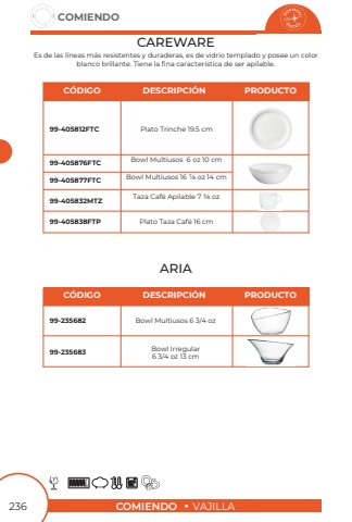 COMIENDOVAJILLACOMIENDO236CAREWAREARIAEs de las l%u00edneas m%u00e1s resistentes y duraderas, es de vidrio templado y posee un colorblanco brillante. Tiene la fina caracter%u00edstica de ser apilable.Plato Trinche 19.5 cmBowl Multiusos 6 oz 10 cmBowl Multiusos 16 7/8 oz 14 cmTaza Caf%u00e9 Apilable 7 3/8 ozPlato Taza Caf%u00e9 16 cm99-405812FTC99-405876FTC99-405877FTC99-405832MTZ99-405838FTPC%u00d3DIGODESCRIPCI%u00d3NPRODUCTOBowl Multiusos 6 3/4 ozBowl Irregular6 3/4 oz 13 cm99-23568299-235683C%u00d3DIGODESCRIPCI%u00d3NPRODUCTO